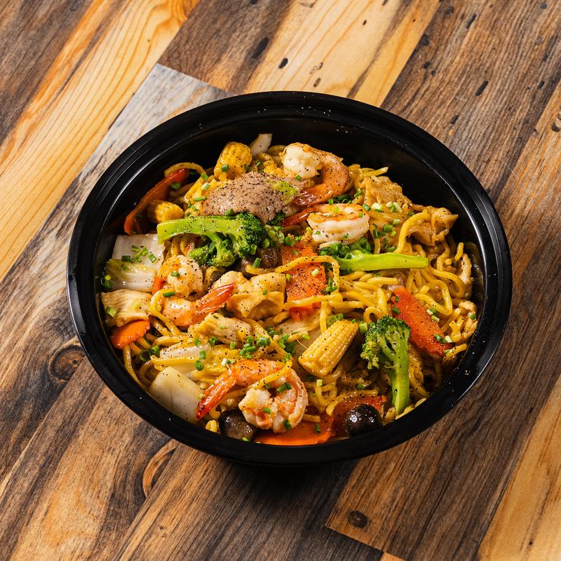 This stir-fried soft egg noodles dish includes a delicious mix of noodles, fresh vegetables, mushrooms, white onions, soy sauce, cilantro, and a choice of protein: tofu, chicken, steak, beef, or shrimp.